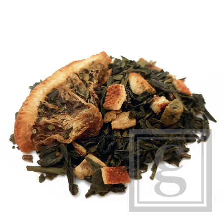 Orange Caramel is een Gearomatiseerde groene thee met stukjes sinaasappel en stukjes karamel.